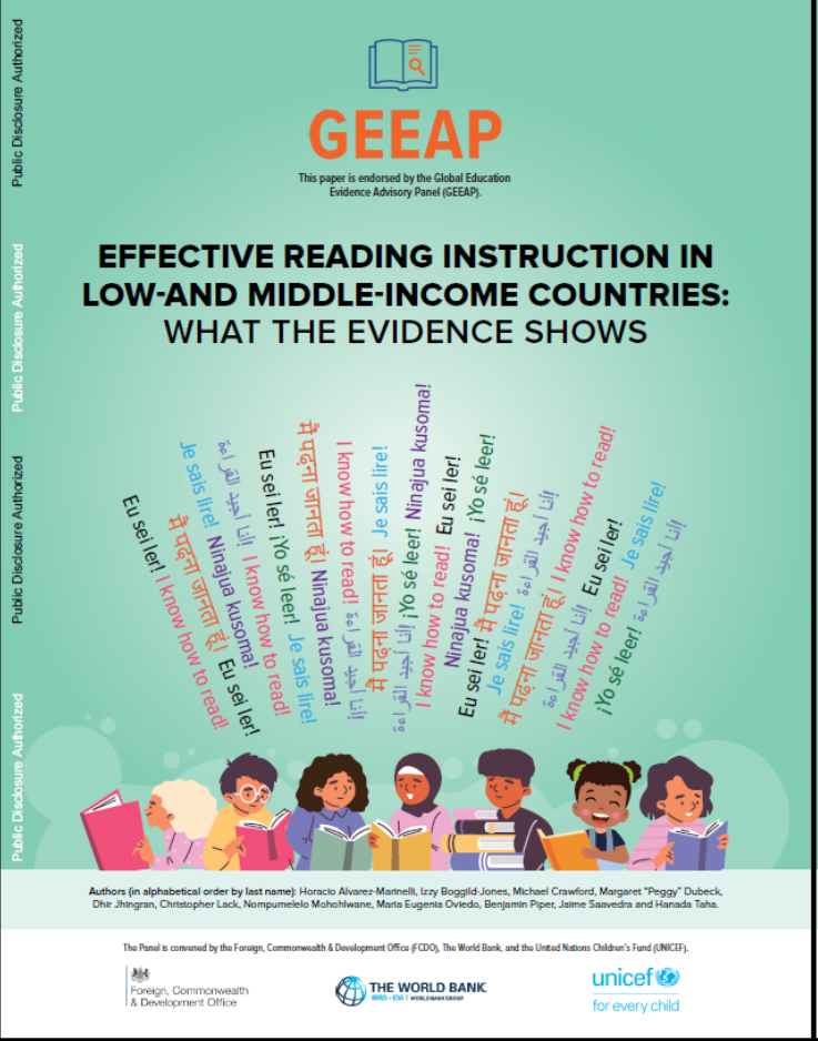 On 30 October 2025 the World Bank issued a report on: Effective Reading Instruction in Low- and Middle-Income Countries: What the Evidence Shows . The report was prepared by the World Bank’s Global Education Evidence Advisory Panel (GEEAP) . The report surveyed evidence from 120 countries and concluded that to address the literacy gap (70% of children cannot read and understand age-appropriate texts), the foundational skills of phonics and language comprehension must be taught by trained teachers.